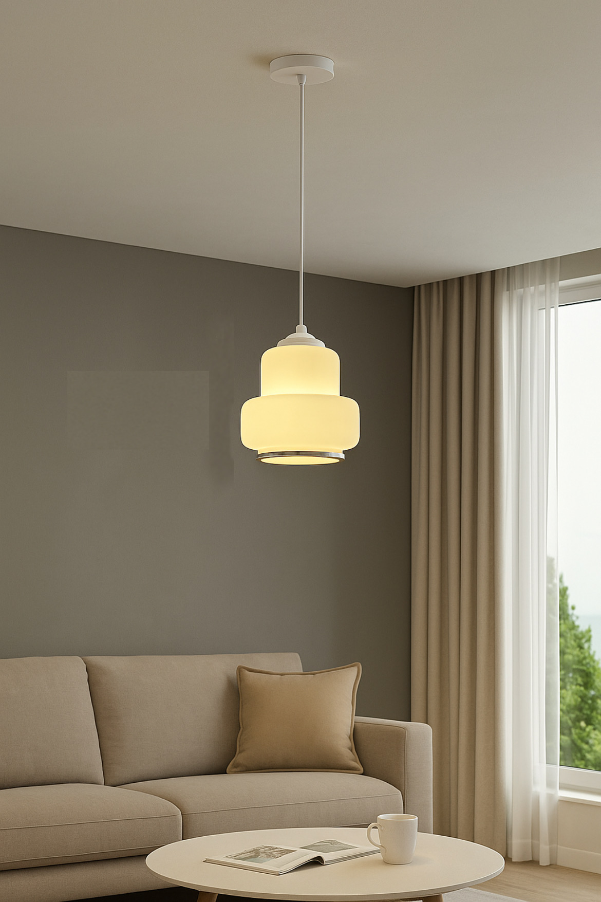 Bring a warm and contemporary charm to your home with the Powerlam Frosted Glass Pendant Light. Designed with a layered, tiered frosted glass shade, this pendant lamp emits a soft, diffused glow—perfect for creating a cozy ambiance in your living room, bedroom, dining area, or hallway. The modern design is complemented by a clean white ceiling plate and wire, making it ideal for minimalist and Scandinavian interiors. Compatible with standard E27 bulbs (LED/filament recommended), this hanging light is as energy-efficient as it is elegant. Whether hung solo or in a series, this Powerlam designer piece instantly elevates your space with gentle lighting and artistic form.