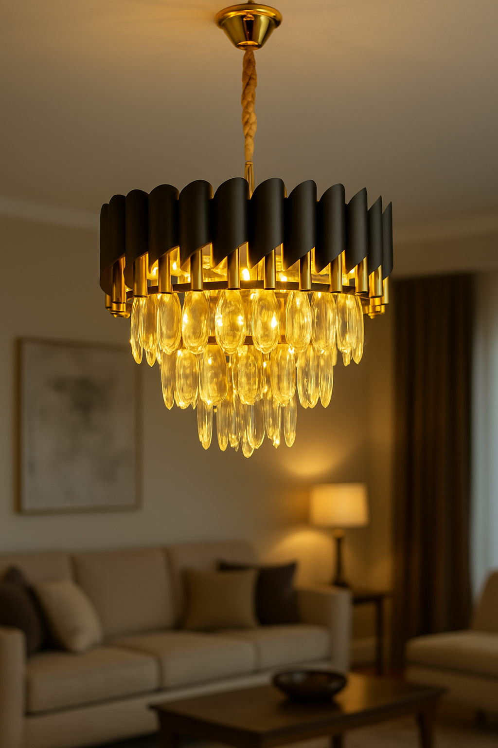 Give your space a majestic glow with the Powerlam Luxury Crystal Chandelier, crafted to perfection with a rich blend of black metal, golden accents, and crystal droplet diffusers. This elegant piece isn't just a light — it's a statement. The chandelier features a layered teardrop crystal design that sparkles under warm lighting, delivering an opulent ambiance to your living room, dining area, or entryway. The black scalloped top ring and polished gold fittings add contrast and depth to any modern or classic interior. Whether you're hosting guests or elevating your home's design, this chandelier brings timeless charm and grandeur.