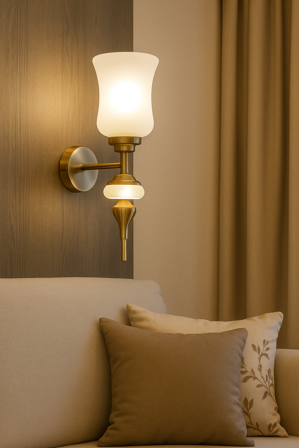 Elevate your interior design with this sophisticated modern wall sconce featuring an elegant brass finish and graceful glass shade. The versatile fixture offers three distinct lighting modes - natural white, warm white, and white light - allowing you to create the perfect ambiance for any occasion. The thoughtfully designed wall light combines decorative and functional elements, with its stylish curved glass shade and premium metallic accents that complement both contemporary and traditional décor. The sconce's unique design incorporates beautiful details like a textured central disc and tapered finial that add visual interest while providing optimal illumination. Perfect for living rooms, bedrooms, corridors, or any space requiring elegant wall lighting. The durable brass construction ensures longevity, while the frosted glass shade creates a soft, welcoming glow. This wall light fixture seamlessly blends form and function to enhance your living space with both style and practical lighting solutions.
