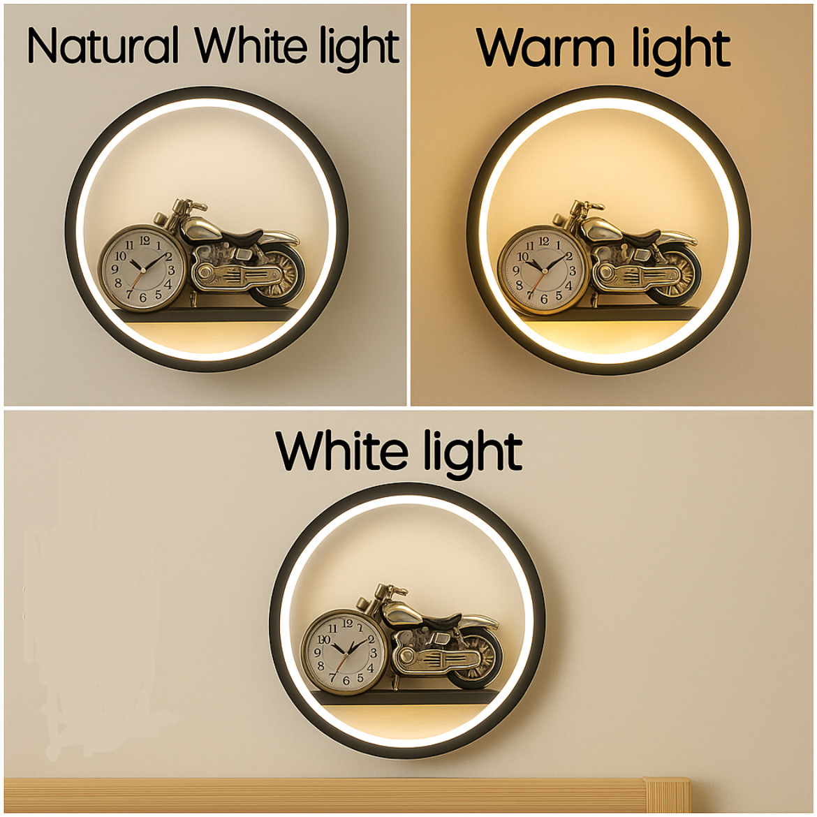 Elevate your home décor with this vintage motorcycle wall clock featuring a modern LED ring light. Designed to blend functionality with style, this eye-catching timepiece comes with three lighting modes: Warm Light, White Light, and Natural White Light, allowing you to match your room ambiance perfectly. Ideal for living rooms, bedrooms, offices, or as a unique gift for bike enthusiasts.