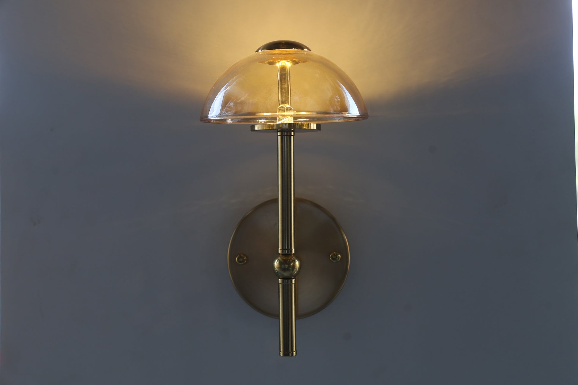 Elevate your interior design with this sophisticated modern wall sconce light featuring a striking brass finish and adjustable dome shade. The elegant glass dome creates a captivating interplay of light and shadow, while the adjustable arm allows you to direct illumination precisely where needed. The circular wall mount provides a stable foundation, complemented by premium brass hardware that adds a touch of luxury to any space. Perfect for hallways, bedrooms, or as accent lighting in living areas, this versatile fixture combines form and function beautifully. The clear glass shade diffuses light evenly, creating a warm, inviting ambiance while maintaining contemporary aesthetics. The robust construction ensures lasting durability, while the timeless design seamlessly integrates with various décor styles. Installation hardware is included for convenient mounting, making this sconce an excellent choice for both residential and commercial applications.